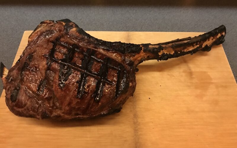 Zutaten: 1 Tomahawk Steak ca. 1200g – 1400g Folienkartoffeln Alabama Sour Cream Bacon oder Kräuter Butter Traubenkernöl Steakpfeffer Meersalz Zubereitung: