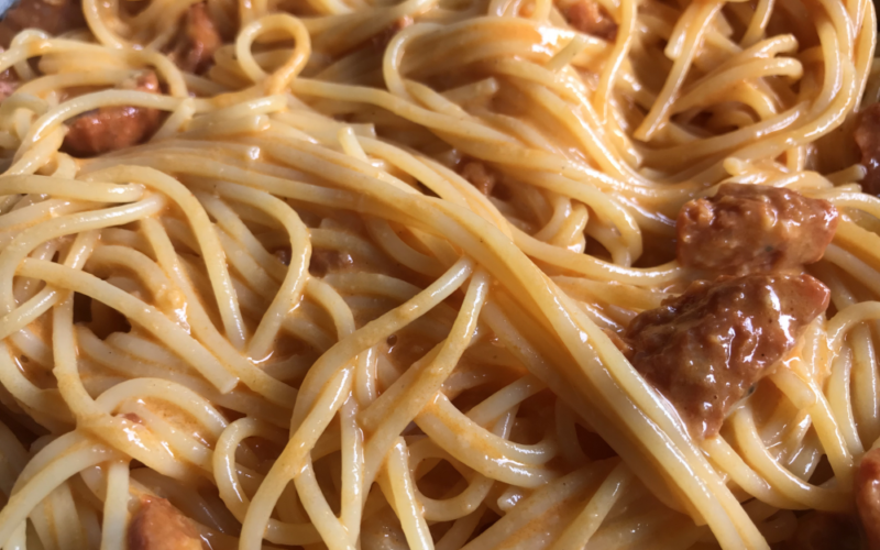 Zutaten: 250 g ungekochte Spaghetti (gerne Spaghetti Nr. 3) 200 g Chorizo (Spanische Paprikawurst) 1 Knoblauchzehe 2 EL Olivenöl 2 ganze Eier & 1 Eigelb