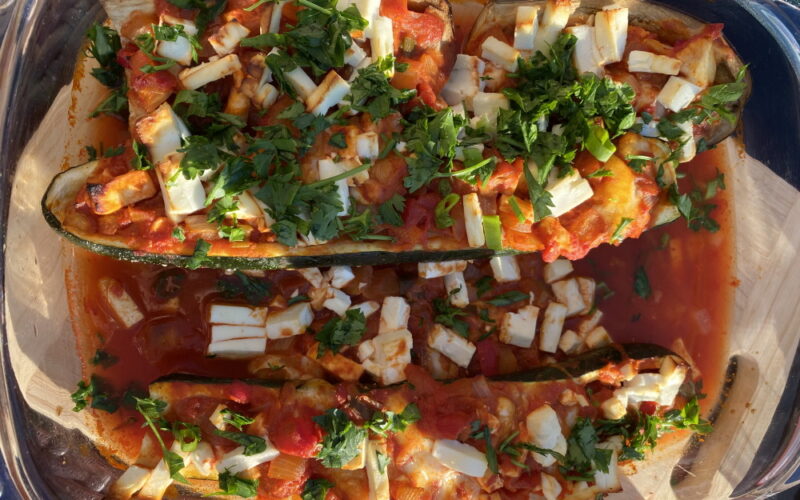 Zutaten für 4 Personen: Zubereitung: Zucchini (oder Auberginen) waschen, halbieren und Fruchtfleisch entfernen. Das Fruchtfleisch klein haken. Die ausgehöhlten Zucchinihälften (oder
