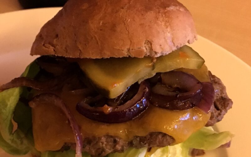 Brauhaus Burger mit Cheddar Cheese, Schmorzwiebeln und Süßkartoffel BunsZutaten: 600 g Rinderhackfleisch 1 EL Öl 1 Zwiebel gehackt 3 Jalapeños, entkernt und