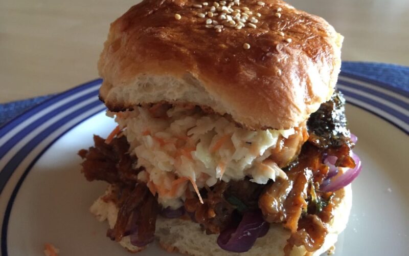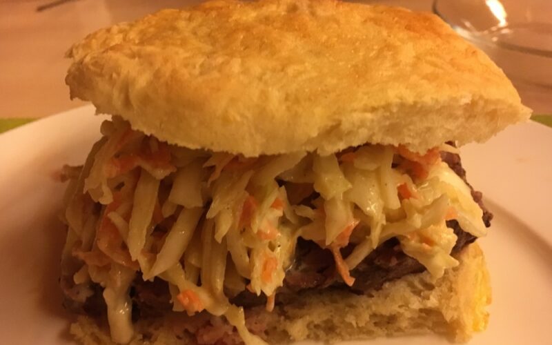 Burger mit Rindernacken, Cole Slaw, Zwiebeln und Süßkartoffel BunsZutaten: ca. 2 kg Rindernacken 2 EL grobes Meersalz 3 EL frischen Pfeffer 200